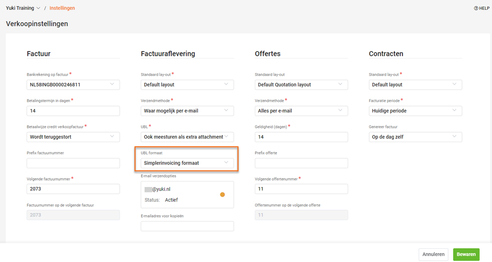 After confirming the activation of e-invoicing, the administrative office or accountant will send a so-called Simplerinvoicing email address that you need to enter in the administration of the customer (government agency) in order to be able to send e-invoices to that specific government agency.