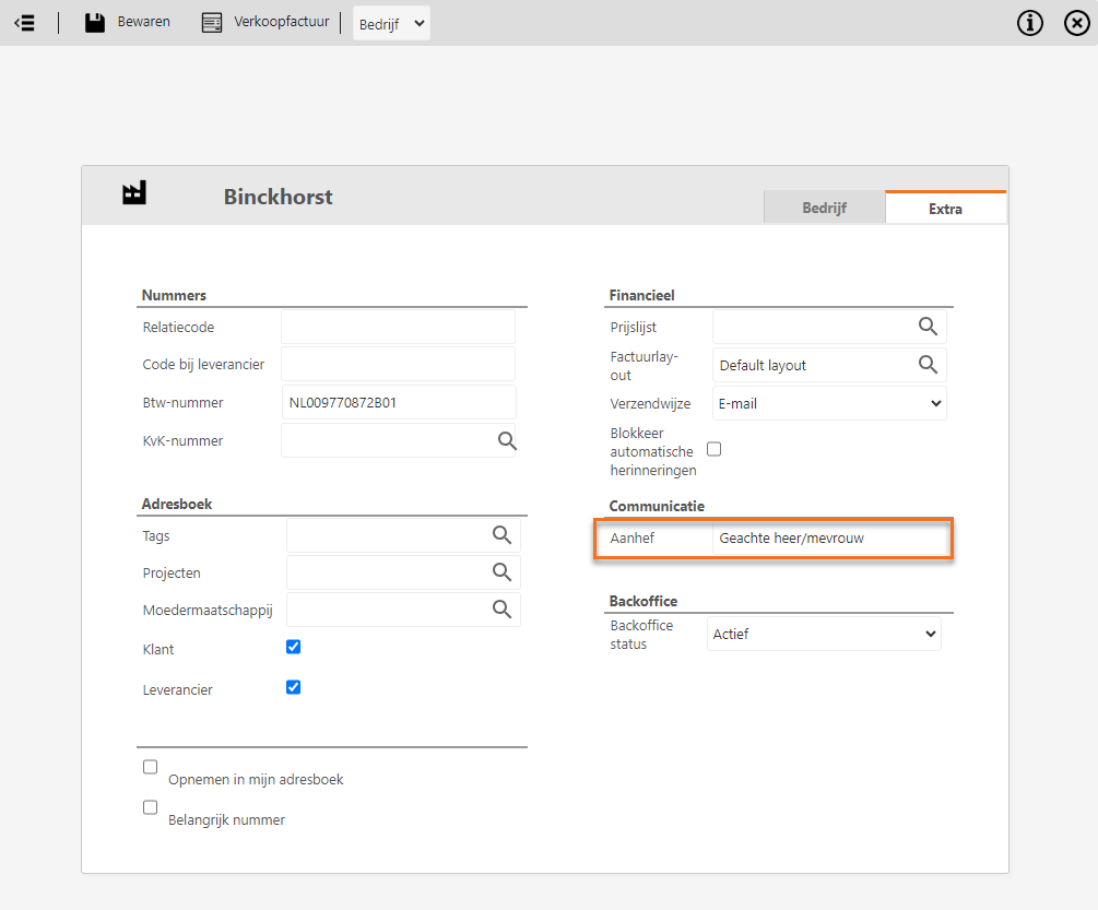 The text in the 'Heading' field on a contact card is automatically used as the salutation (placeholder [heading]) in the text of the e-mail. This text must be translated into the correct language.