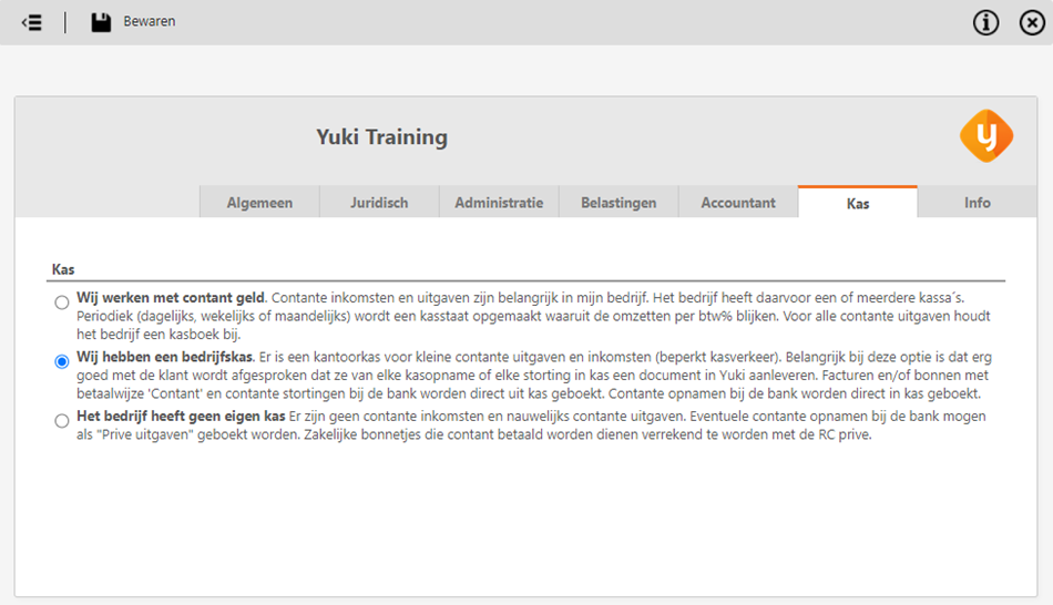 This option is only recommended if there are limited cash transactions (money box for small expenses). Yuki will create a petty cash book in order to track cash transactions and VAT. The key with this option is that it is very clearly agreed with the customer that they will provide a document in Yuki for every cash withdrawal from or deposit into the money box. Invoices and/or receipts with the payment method 'Cash' are booked directly in the petty cash book. Cash withdrawals at the bank are booked directly in the petty cash book. Cash deposits at the bank are immediately booked out of the petty cash book. - Rare cash transactions (payment method 'From private' is available when booking a purchase invoice)