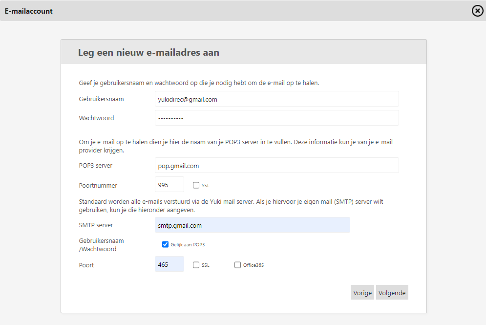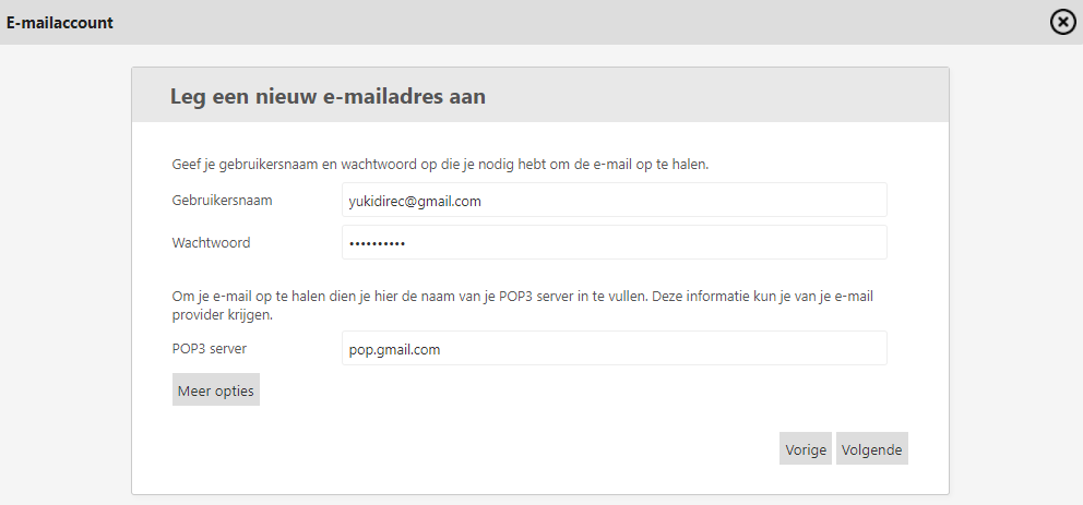 Step 2. This is where you enter the username and password. The username can be the same as the email address but it does not have to be. Using the email address you entered on the first screen, the software determines which POP3 server to use to retrieve the mail. It may happen that Yuki doesn't know which POP3 server to use and you will be asked to enter this yourself. Should this happen, first try mail."Your websitename".nl if that doesn't work, you should contact your provider.