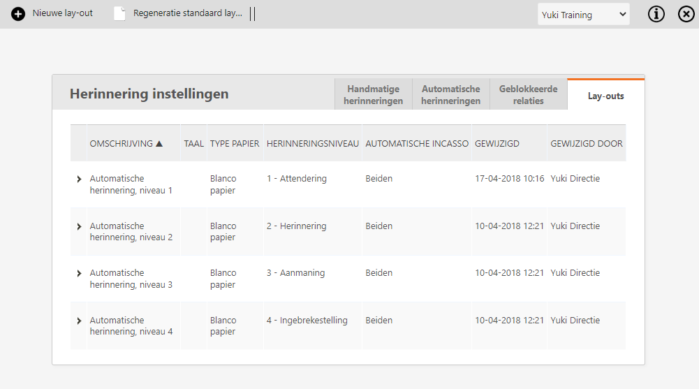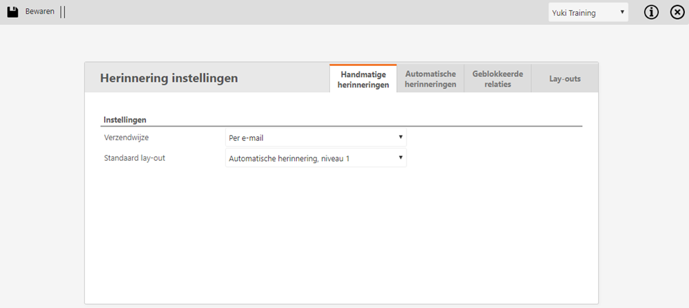 Only if Yuki's reminder and demand for payment service is activated (automatic sending of reminders), settings on the Automated reminders and Blocked contacts (no reminders) tabs should also be defined.