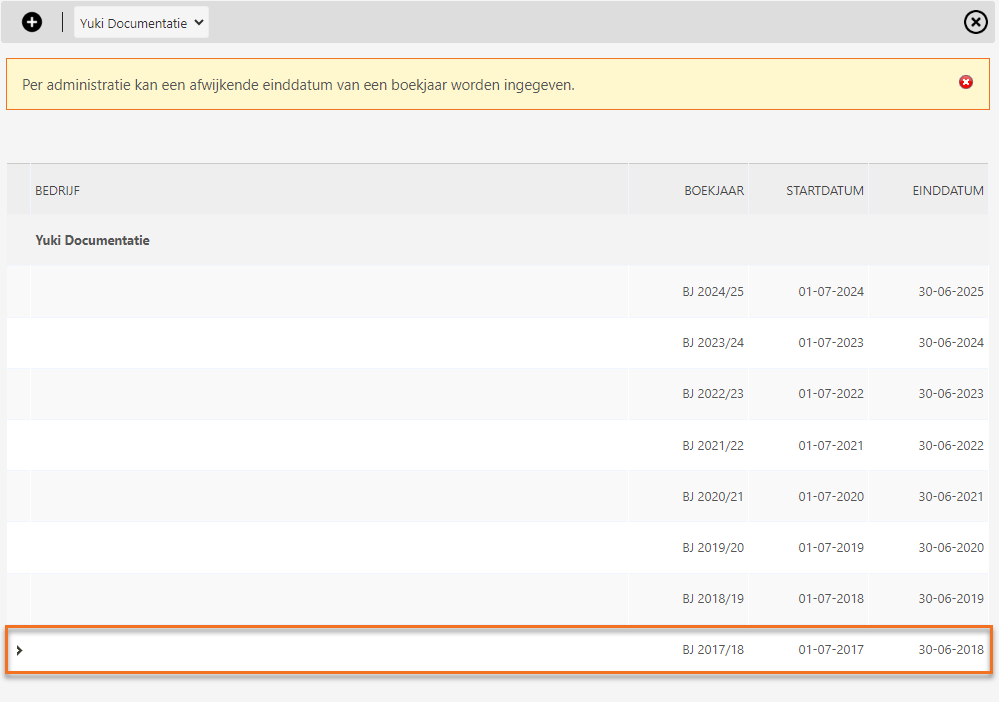To change the end date of one of the financial years, click on the + button and then select the relevant financial year and the required end date.