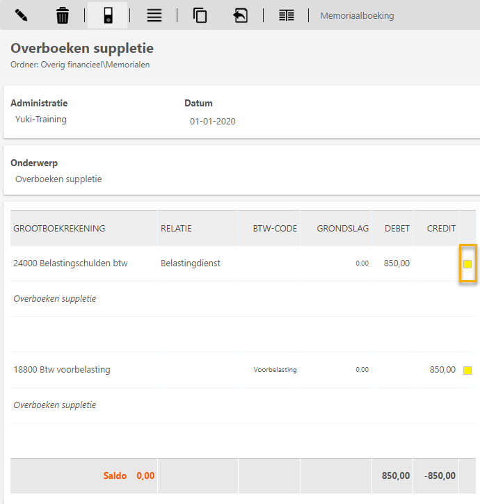 The general journal entry can then be matched with the supplement by clicking on the yellow square. It is important that 'tax authorities' is filled in. Without the same contact, it is not possible to match the general journal entry with the supplement.