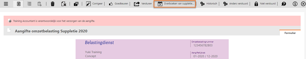 As of the 2020 financial year, you can use the 'Record VAT supplement amount in next financial year' button to post a supplement under 1000 euros in the first VAT accounting period of the next financial year.