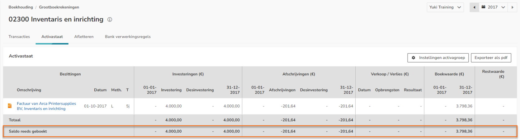 If the amount of depreciation already booked in a certain period is higher than the depreciation calculated by Yuki, Yuki will carry the difference forward to the next period as a balance already posted. The proposed journal entries will therefore also be lower during that period.