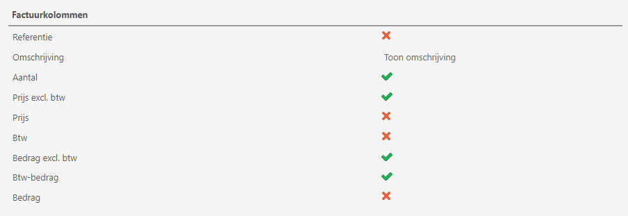 In this section, you can specify which information should be printed on your invoice. The columns you choose sometimes depend on the layout you've chosen. Think primarily from the customer's perspective. What is important for the customer to see on the invoice line?