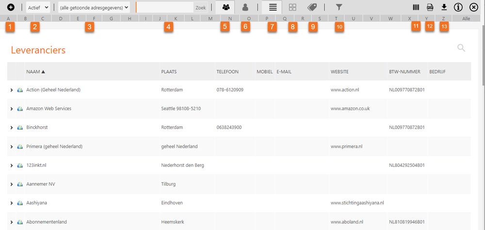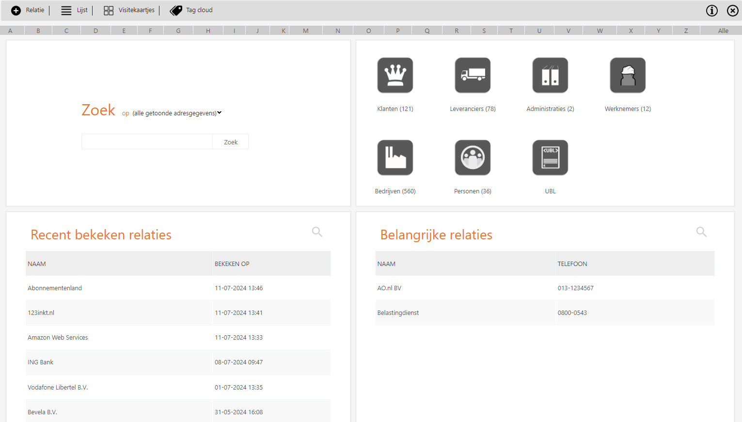 In the Contacts functionality, you can view a number of overviews of contacts that basically show the same list but with a different contact type. The different contact types are: customers, suppliers, administrations, employees, companies and persons.