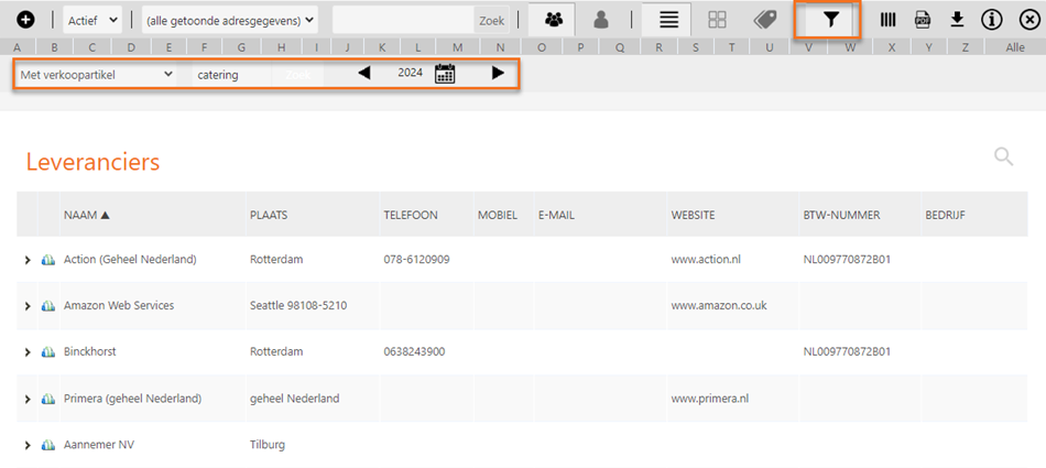 - Here make a selection on which you want to filter the suppliers: all shown address details, Name, City, Postal code, Tag, Email address, Website, Phone, Contact code, CoC number, VAT number, Bank account or Suppliers code.
