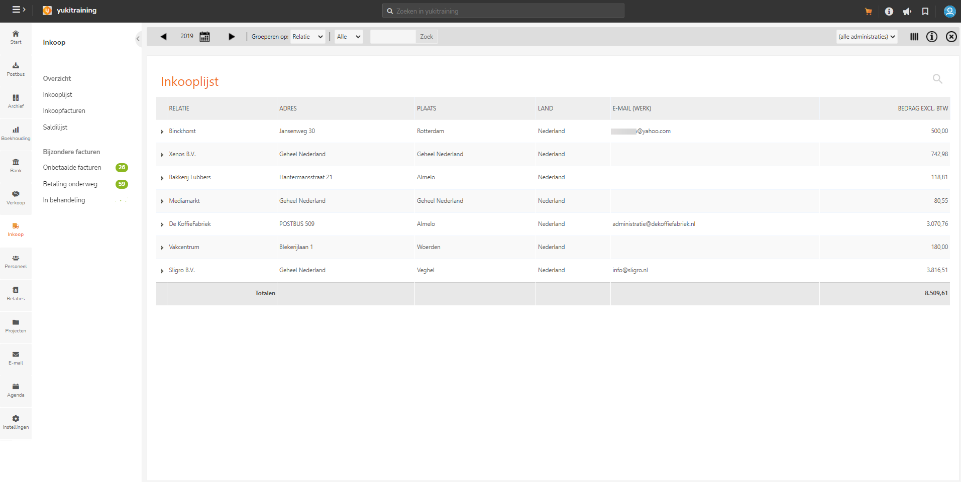 The purchasing administration bundles all matters related to suppliers and purchase invoices. Several overviews give you insight into your purchase history. Additionally, you can also view the status of all purchase invoices: unpaid, payments in transit, and processing.