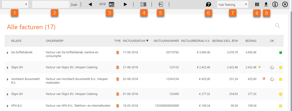 In Yuki, you can view an overview (with a search function) of all purchase invoices. You can search by subject, amount, invoice number, etc. You can also filter by all purchase credit notes, all unpaid or partially paid invoices, among other things.