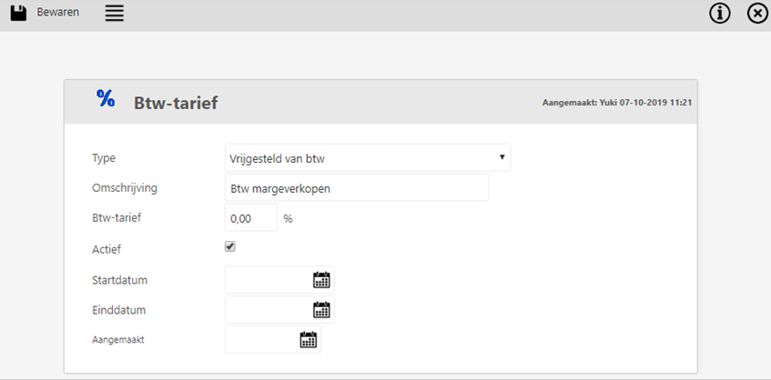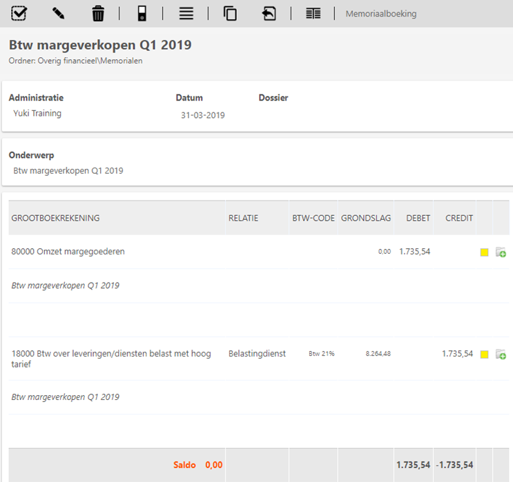 When booking both purchases and sales, transactions falling under the margin scheme must be posted to separate GL accounts, as this makes it easy to calculate the margin per period from the general ledger. So, separate accounts are maintained for margin transactions for both purchases and sales. At the end of a VAT accounting period, the profit margin is calculated by subtracting your margin purchases within that period from your margin sales within the same period. When the profit margin is positive, you multiply it by 21/121 (for 21% goods) or 9/109 (for 9% goods). You book the calculated VAT to be paid via a manual general journal entry in Yuki, as this general journal entry should not affect the calculation for the next period.