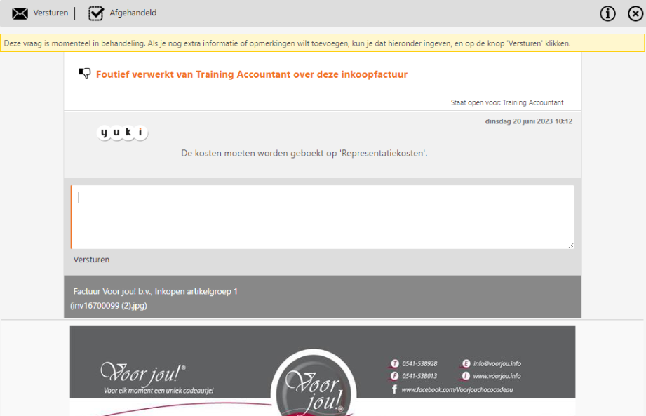 As long as the question is not yet answered by the back office, the user will see the following notification when opening the question: This question is currently pending in Yuki. If you want to add some extra information, enter it below and click on the 'Send' button.