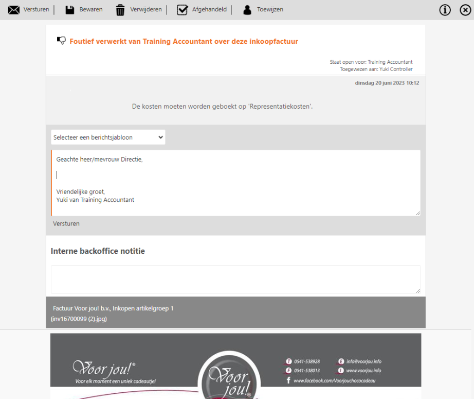 Assign: the back office can assign the question to a colleague. Extra information that can be important for this colleague can be entered under 'Internal back office remark'. Moreover this internal back office remark is not visible for the user.