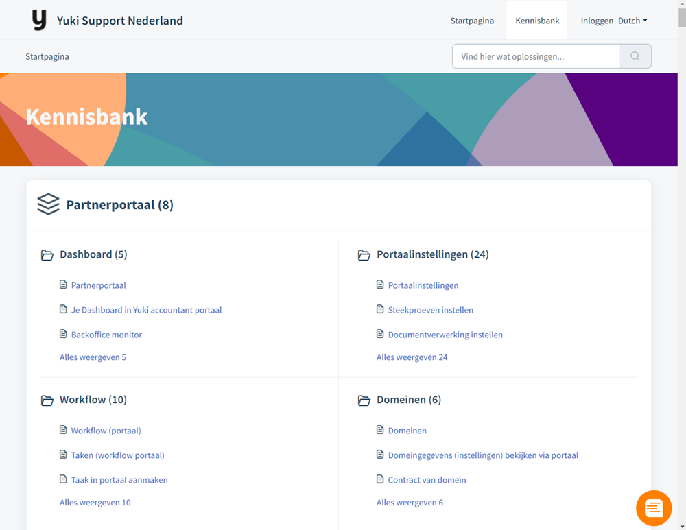 In the Knowledge base, you can find all the articles that will help you use Yuki. The layout of the Knowledge base is based on the Yuki software. For example, the categories are organized based on the Yuki main menu in the software. Within these categories, you can find folders that create an additional layout based on Yuki functionalities/features. You can compare this to the submenu you see in Yuki when you are in a functionality/feature.