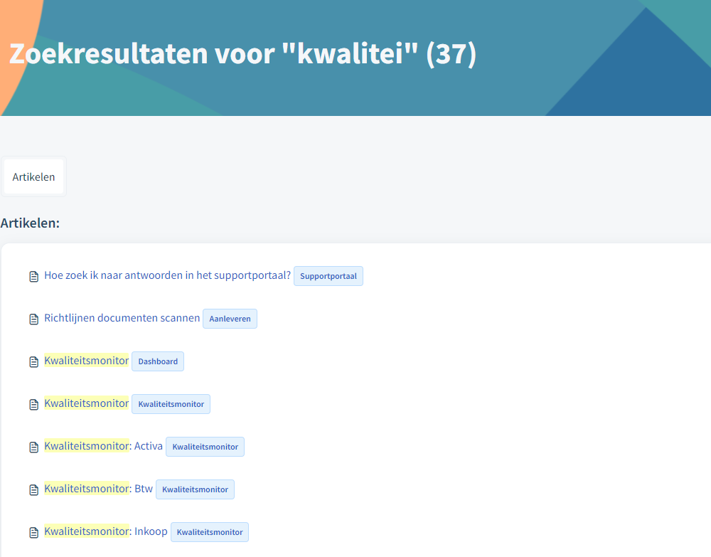 In the screenshot below, we searched for "kwalitei" and then clicked on Show all. We then clicked on the appropriate suggested article. The article opened.