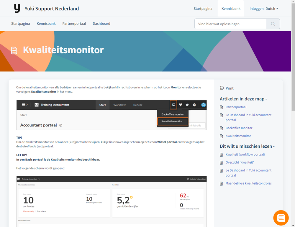 You can immediately see that we are in the Quality Monitor article. This article is in the Partner portal category in the Dashboard folder.