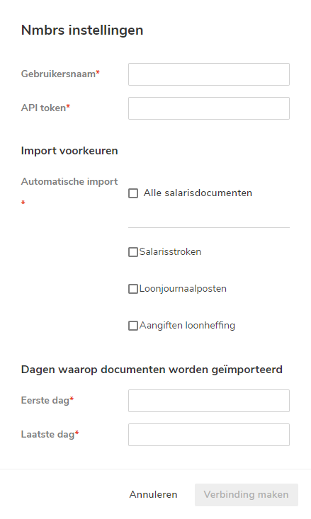 To configure the Nmbrs® link, you must enter the Nmbrs® access codes and the import settings for the payroll documents.