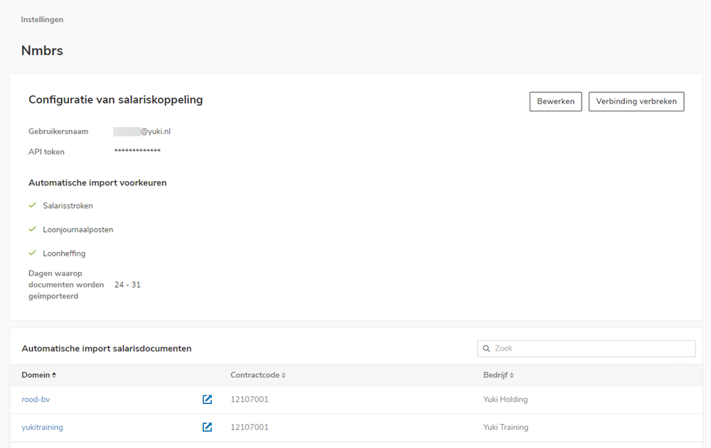 The username (the email address used to log into the Nmbrs® environment) and API token listed in the now-opened Nmbrs® screen must be entered in Yuki.