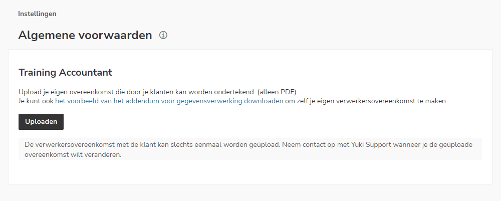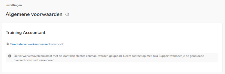 - The customer data processing agreement can only be uploaded once. If you want to change the uploaded data processing agreement please contact Yuki support.