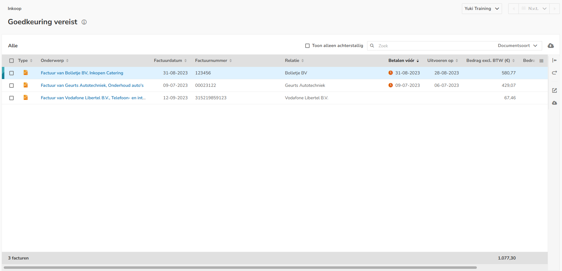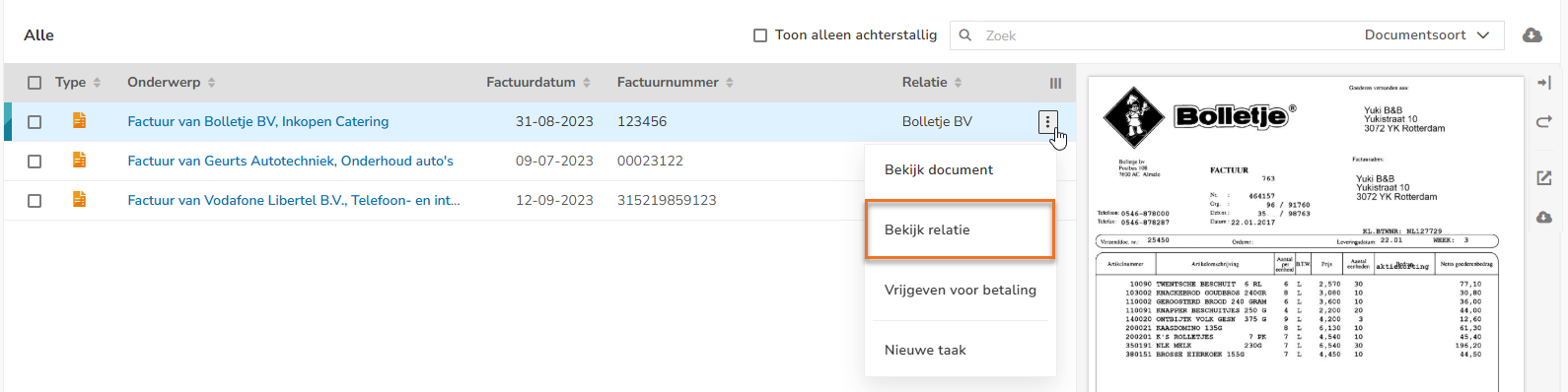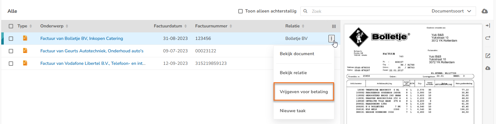 In Yuki, you can view an overview of all purchase invoices that are on hold. These are invoices that have not yet been paid or collected and need to be sorted out.