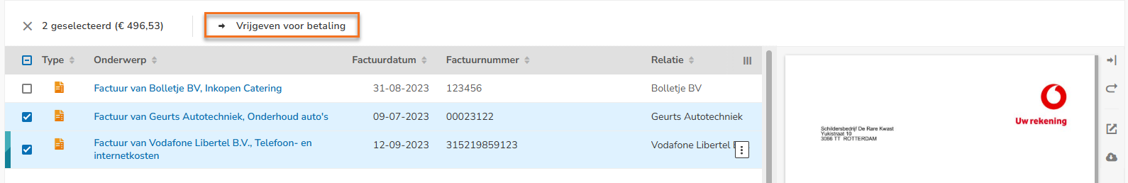 (only available when a user with the ‘Management’ role has selected the Medium, Large or Unlimited bundle via the Yuki Store in the domain and the purchase invoice is linked to a project) - release one or more invoices for payment