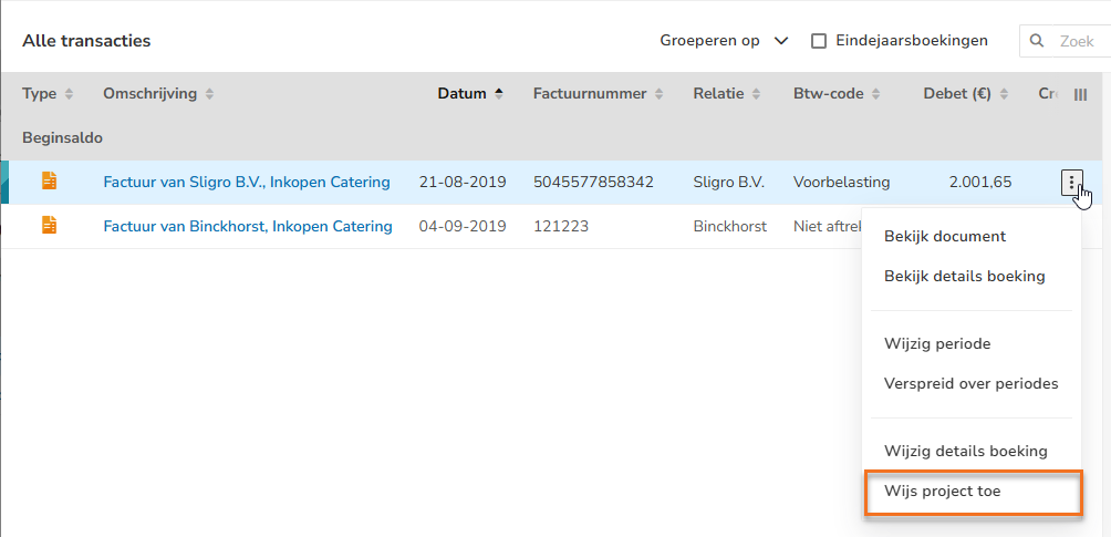 - Click on the button with the three dots behind the relevant invoice and select the Assign project option from the now-opened menu