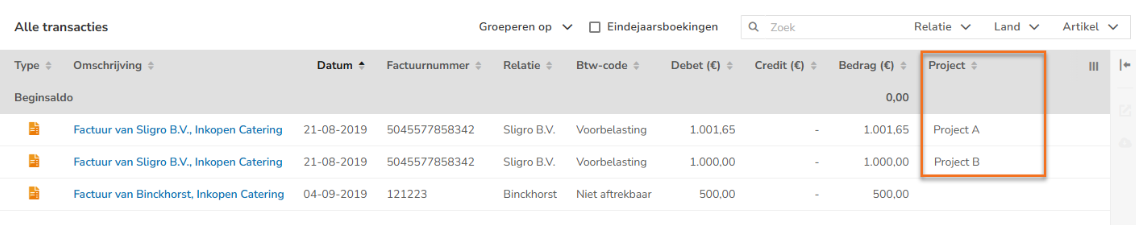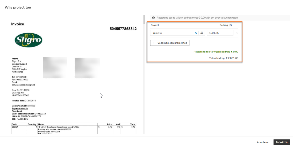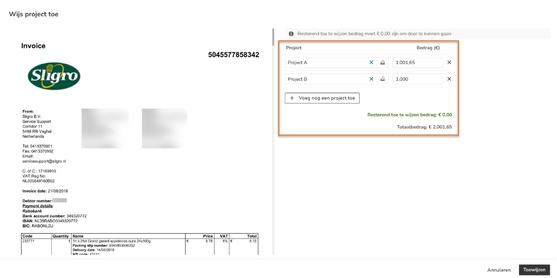 Additionally, the transactions of an invoice can be split, if necessary, so they can be assigned to different projects.