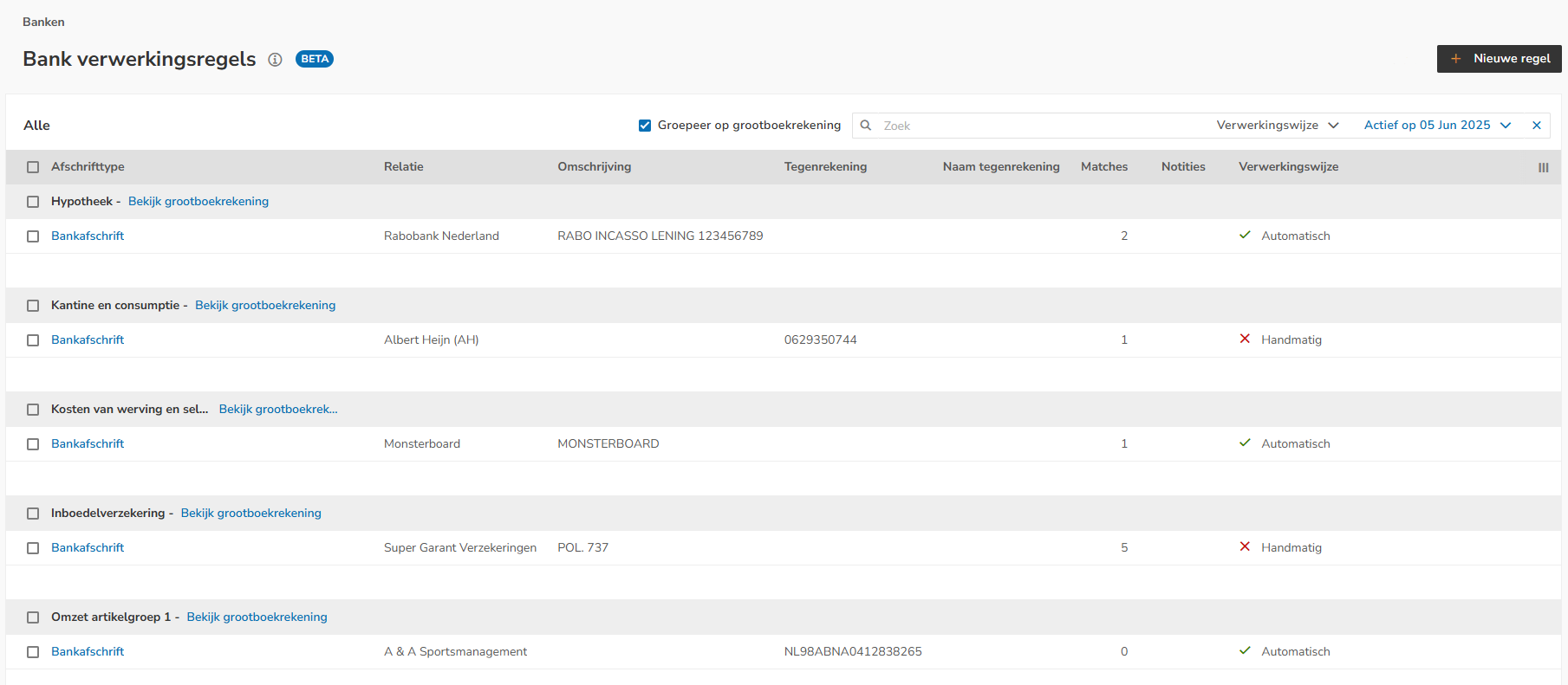 In Yuki, you can view an overview of all bank processing rules created in a domain.