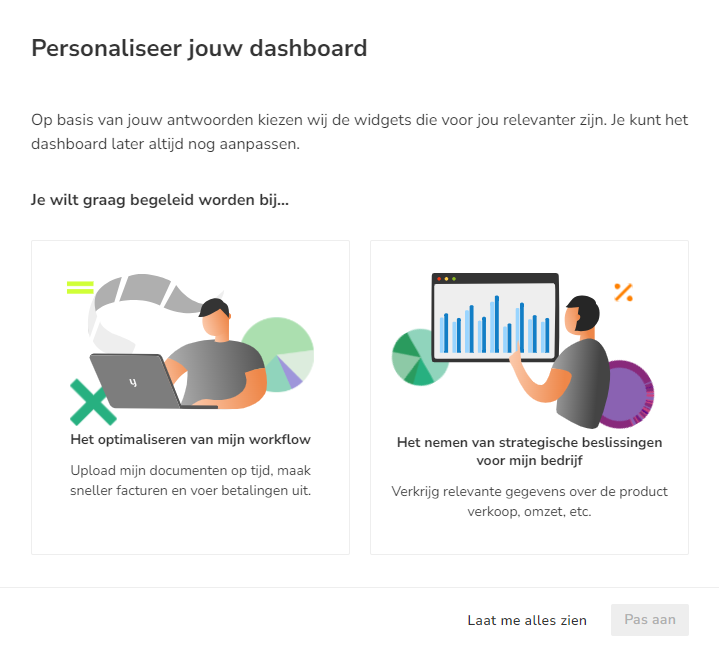 After logging in to the new Home screen for the first time, a user with the 'Management, 'Financial Administration' or 'External Accountant' role can specify in the now-opened screen whether the 'Outstanding' and/or 'Insights' section should be shown on the Dashboard: