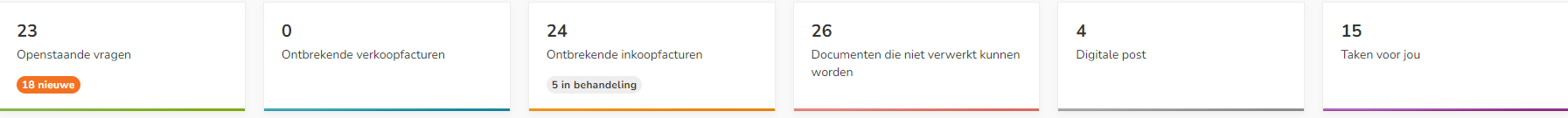 For a user with the 'Purchase', 'Sales' or 'HRM' role only the sections 'Outstanding questions', 'Unprocessed documents' and 'Tasks for you' are available in the 'Key figures of your domain' section of your domain.