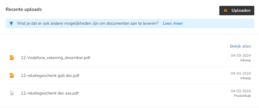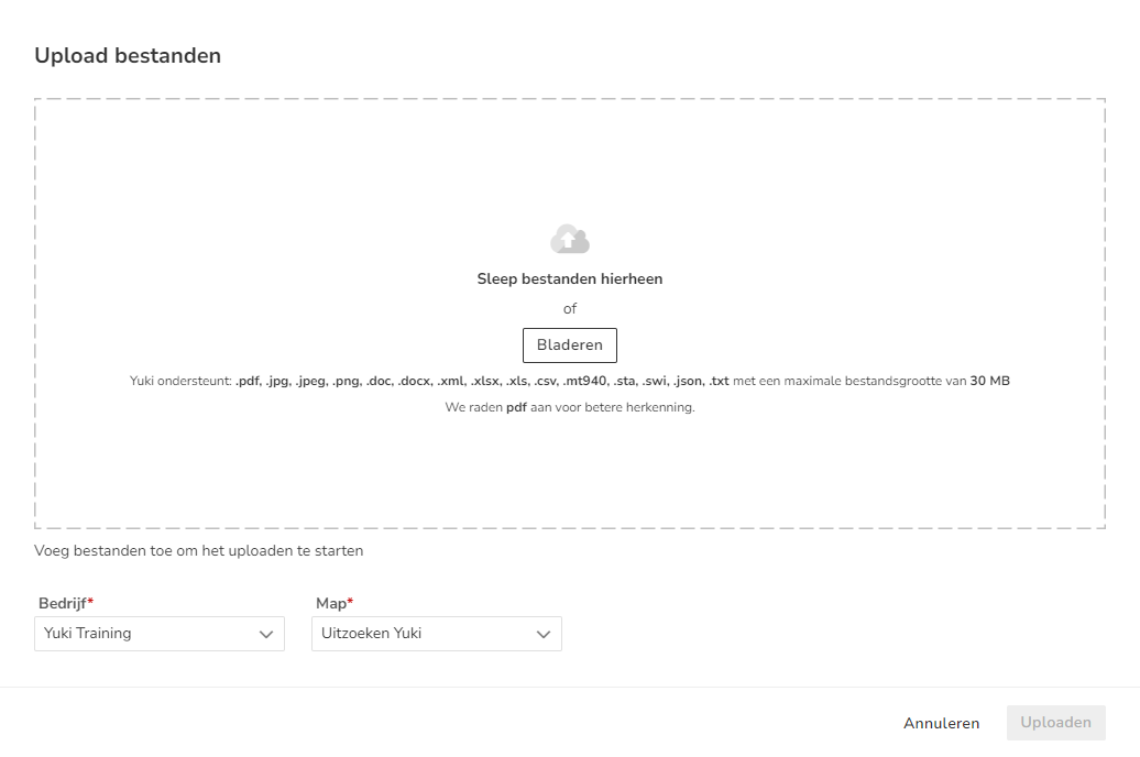Find and select the files you want to upload, select the appropriate administration (company) and folder where the files should be uploaded in Yuki, and then click on the Upload button.