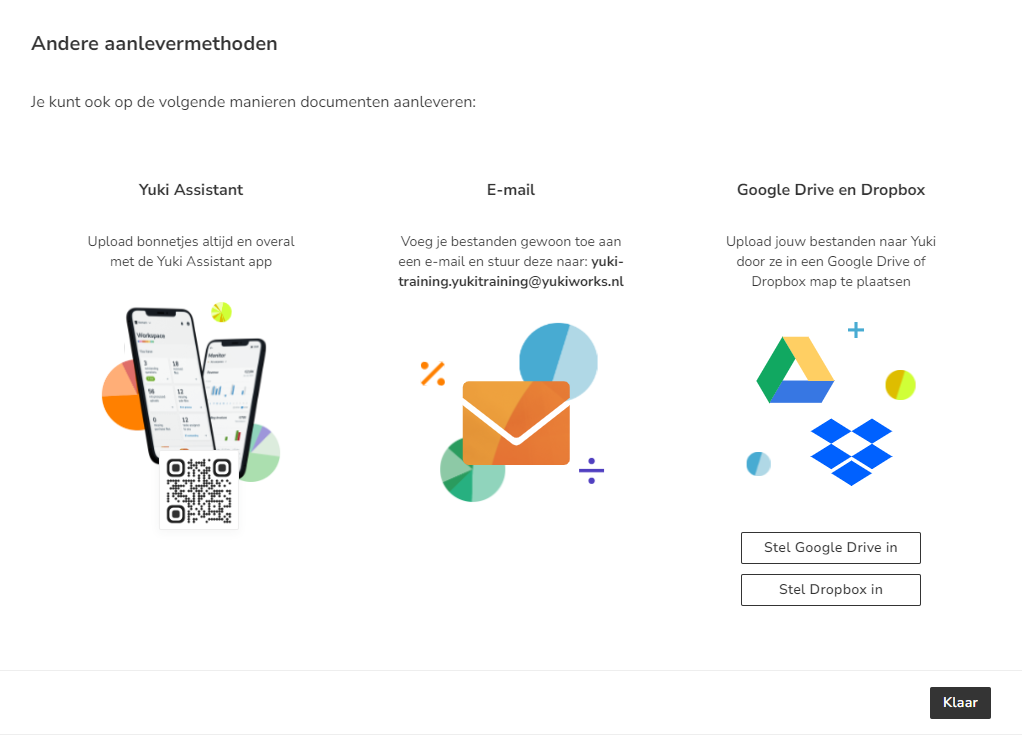 - Yuki Assistant app (see article Submit documents via Yuki Assistant app)