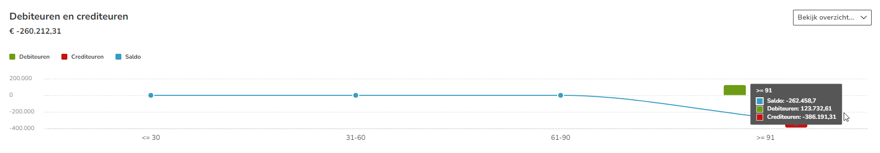 - Hover your mouse over a chart to see the data for a particular month or age of outstanding customer and supplier items in more detail.