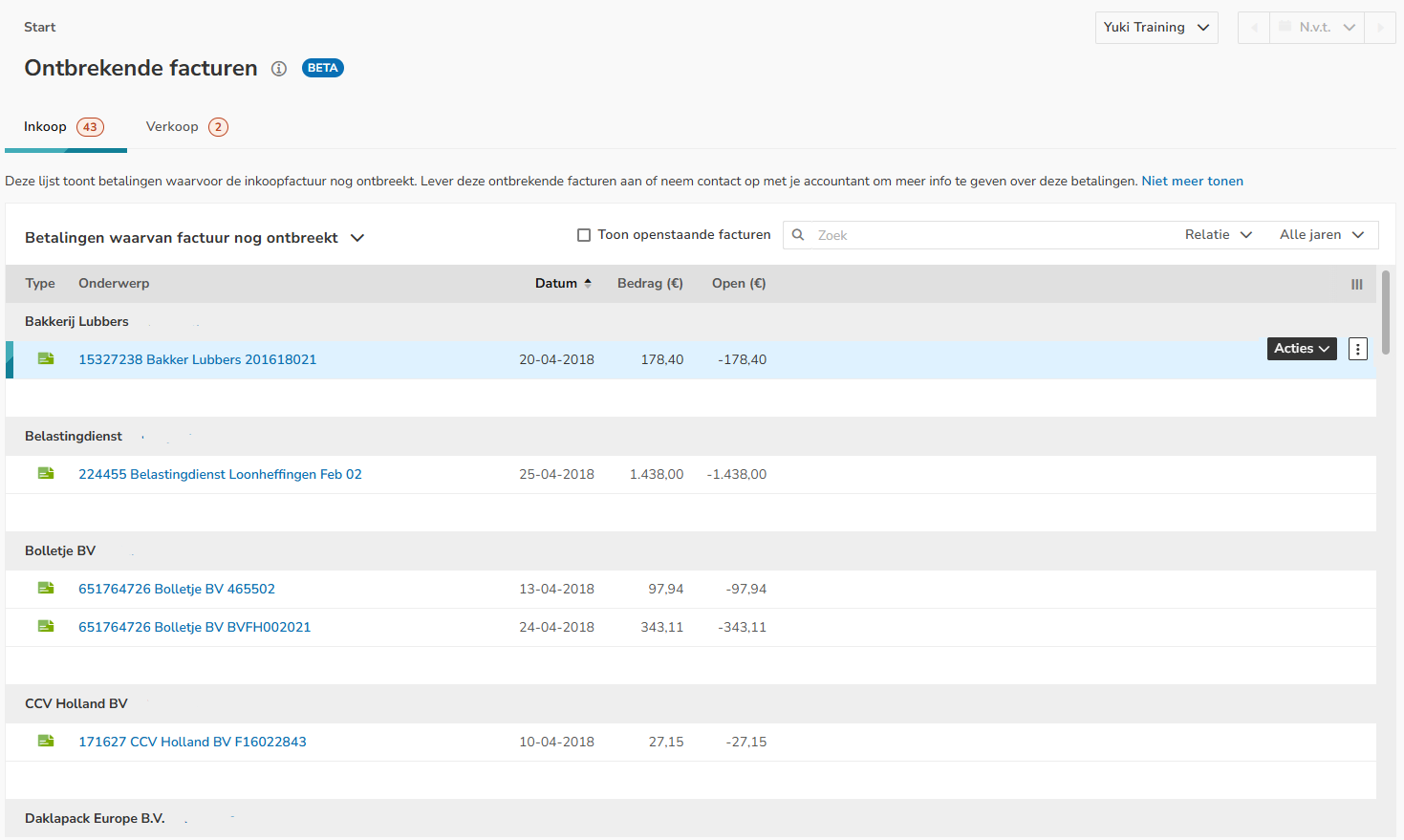 To ensure a complete and reliable administration, Yuki automatically checks whether all purchase and sales invoices and receipts are present. This check is based on outstanding payments: payments for which no corresponding document (such as an invoice or receipt) has been found are shown in an overview.