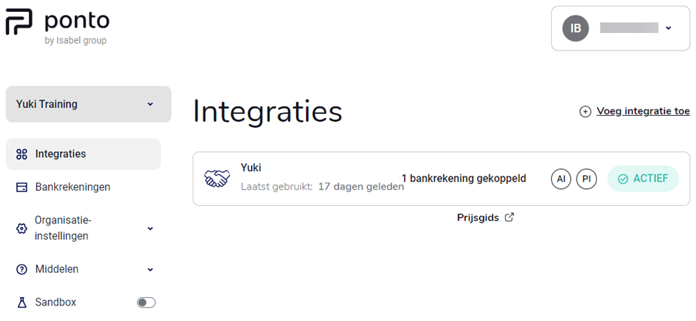 - navigate to 'Integrations' and you will see the Yuki integration with the number of linked bank accounts