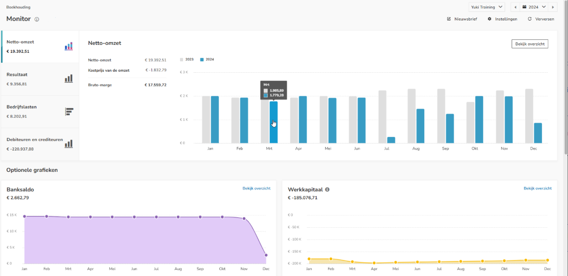 In the financial monitor in Yuki, you can see your company's key indicators (ratios) graphically shown. View the development of your revenue, margin, and profit, bank balance, cash balance, the age of outstanding customers and suppliers, as well as more complex KPIs (Key Performance Indicators) such as working capital, solvency, and profitability.