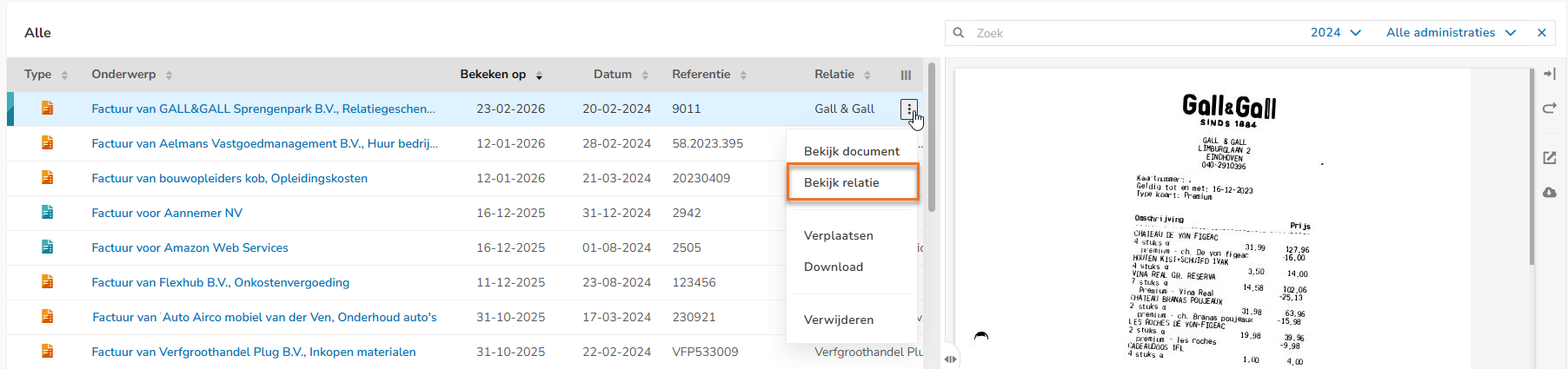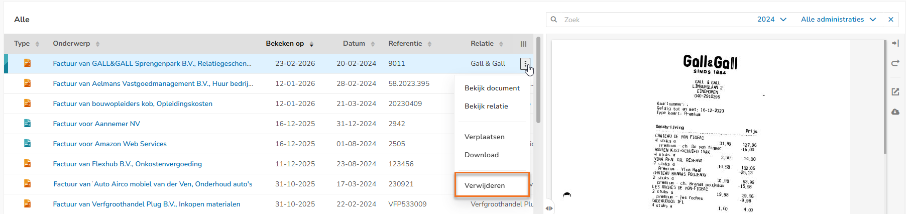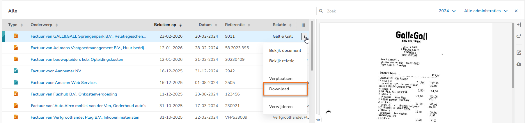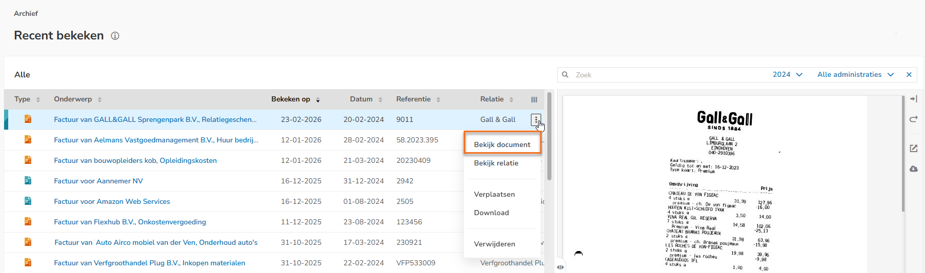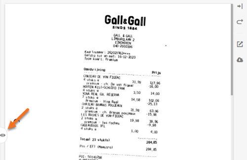 Click on the relevant invoice line and then on the Show / Hide button (icon with a right / left arrow) to show or hide the document preview on the screen.
