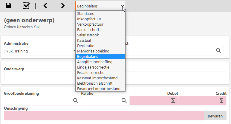 To create the opening balance for the first financial year in Yuki, you need to enter the closing balance from the previous financial year. This can only be done in a special general journal 'Opening balance' (document type 'Opening balance sheet').