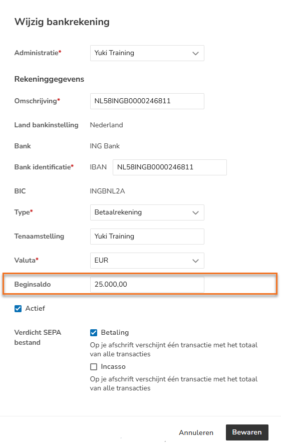 - For each bank account, enter the correct opening balance in the Opening balance field (the balance as of the last date before the start of the first financial year in Yuki). That balance will then be automatically posted to the '11099 Suspense account opening balance banks.'