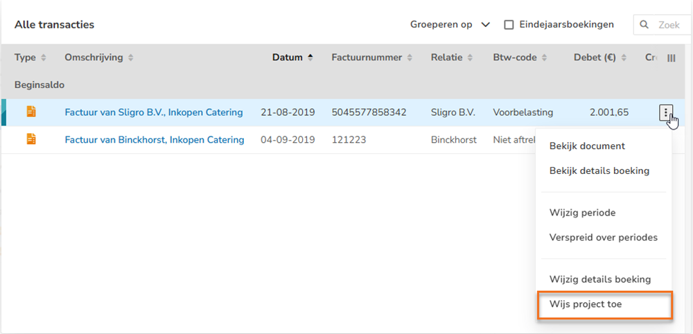 Click on the button with the three dots behind the relevant invoice and select the Assign project option from the now-opened menu.