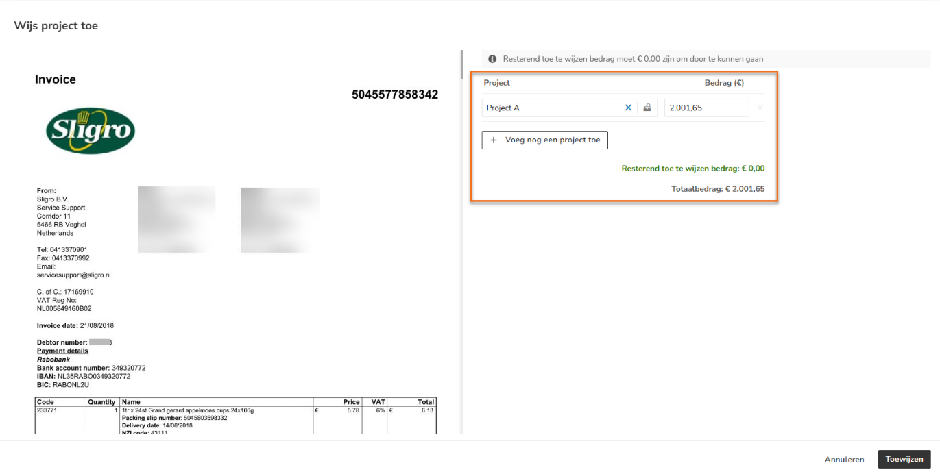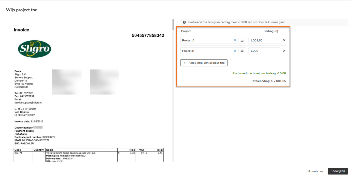 If you want to assign the transactions of a purchase or sales invoice to two or more projects, click on the Add another project button. A second line is shown where you can allocate the remaining amount to another project. This way, you can split a transaction line and link it to different projects.