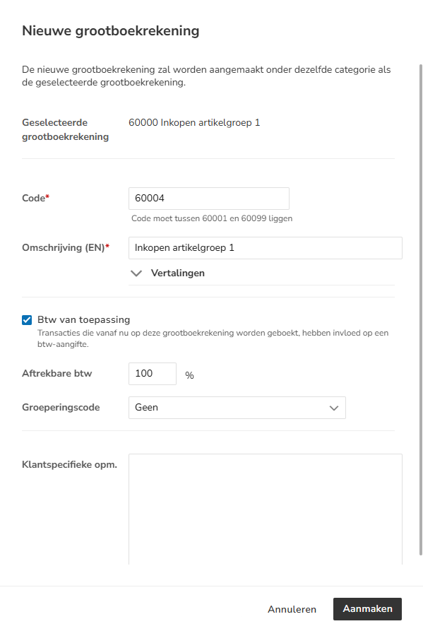 Click on the arrow behind the GL account description to translate the description into English, French, or Spanish. - VAT applicable: is VAT applicable (should bookings on this GL account be included in the VAT return?)
