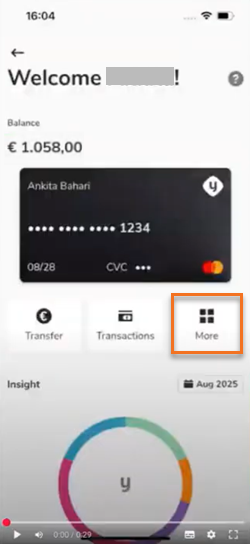 To deposit money to the Yuki Pay checking account from another bank account, click on the More button in the Yuki Pay home screen.