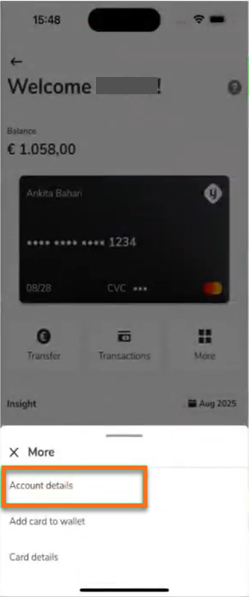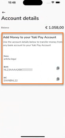 - Click on the icon behind IBAN or BIC to copy the details directly.