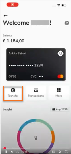 To transfer money from the Yuki Pay checking account to another bank account, click on the Transfer button in the home screen of Yuki Pay.