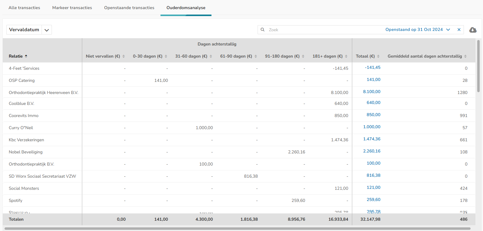 The aging analysis shows all amounts per creditor, debtor, or employe that have been outstanding for more than 30, 60, 90, 180 days, or longer. The analysis was performed based on the invoice date.