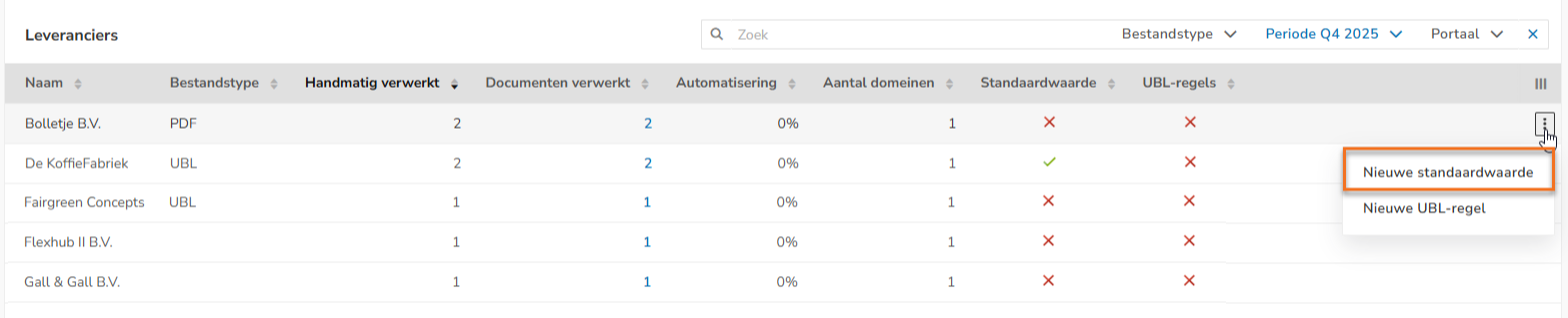 In the Default values and UBL rule columns, you can see by the green check mark or the red cross whether there are automation rules for the supplier.