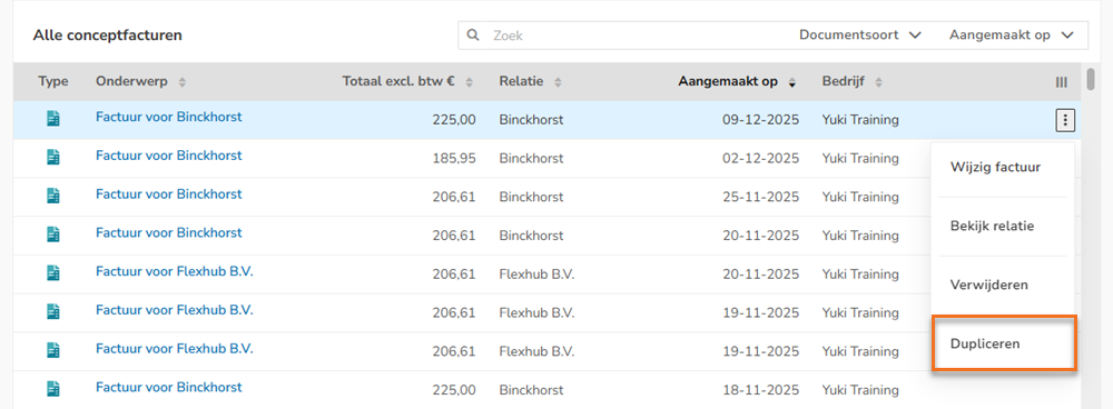 The draft invoice duplicate is created immediately and shown at the top of the overview.