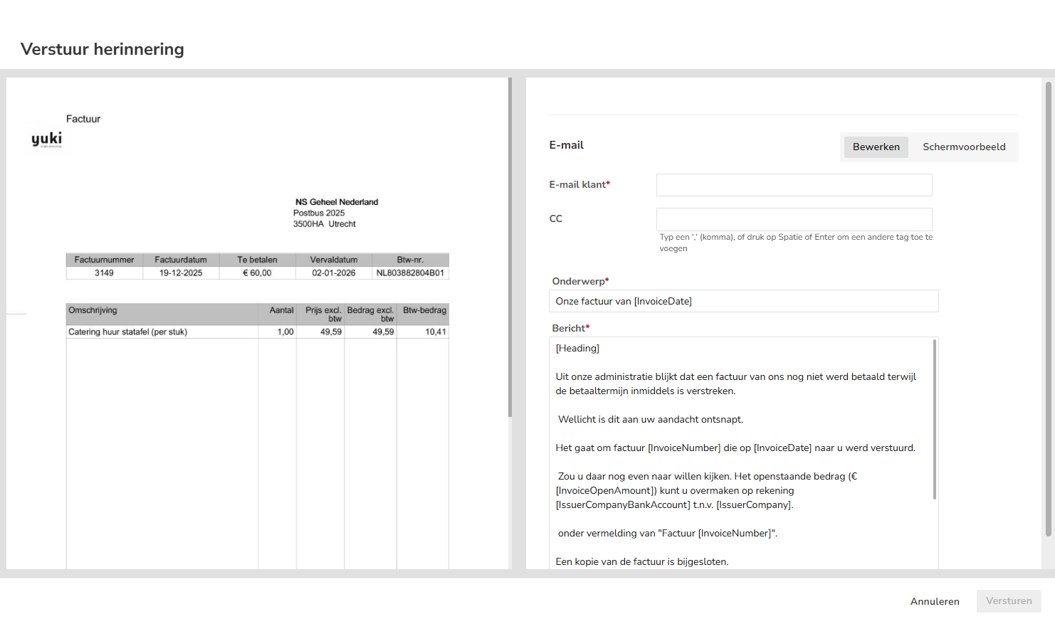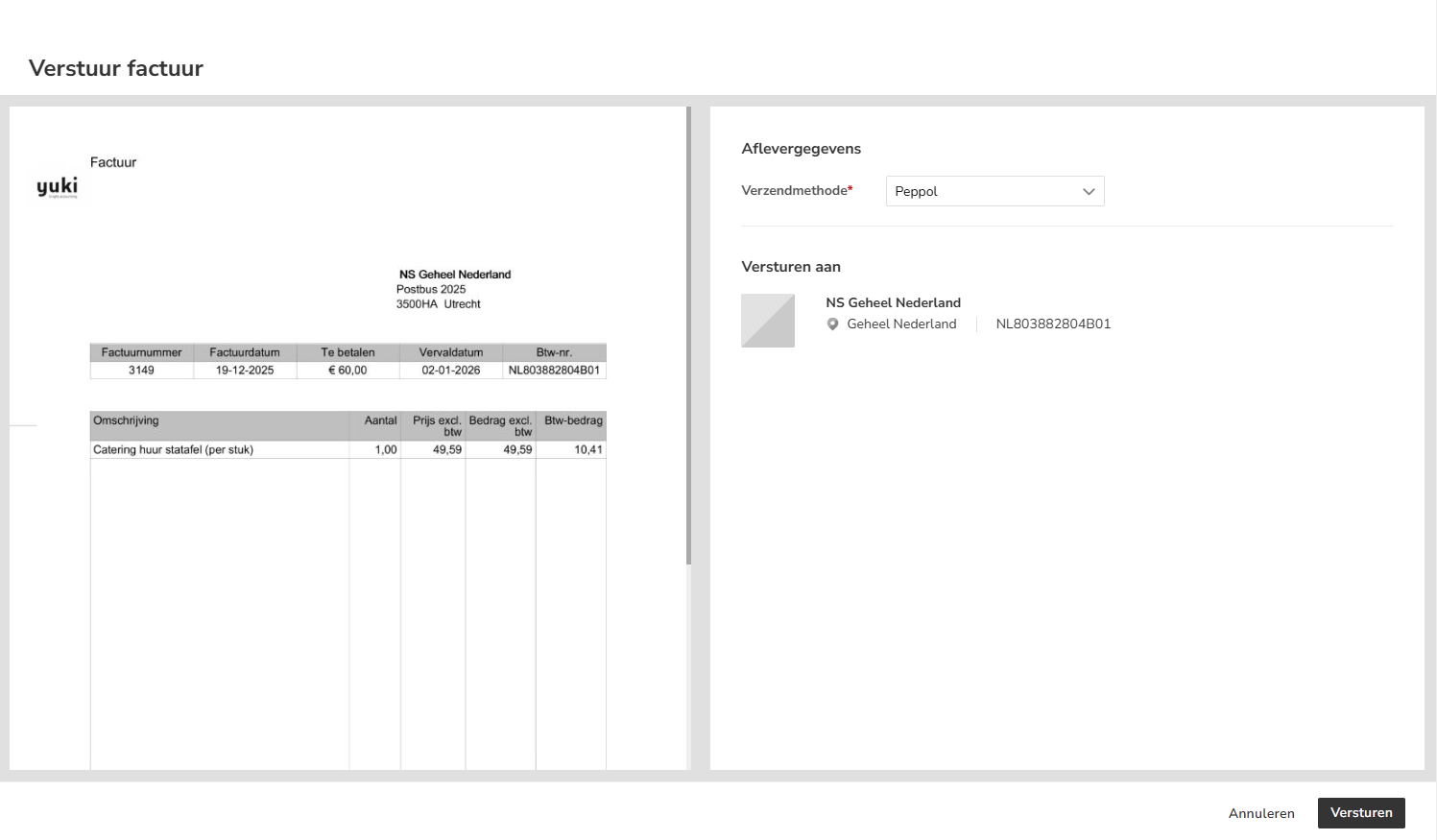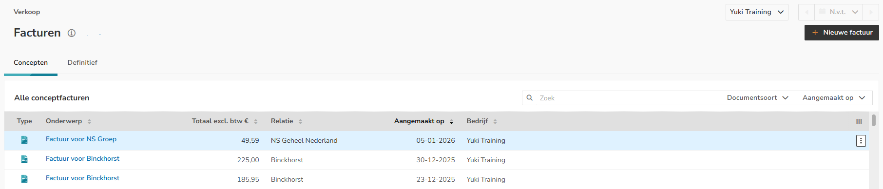 The duplicate concept invoice can now be changed if required and then saved as a concept invoice or finalized and sent immediately.