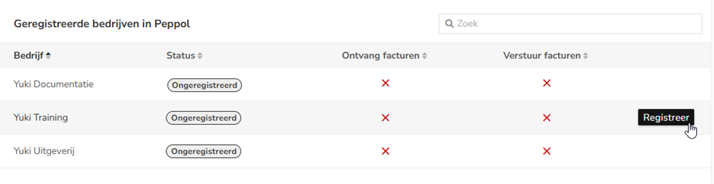Hover your mouse over the line of the company you want to register with Peppol, then click on the Register button.